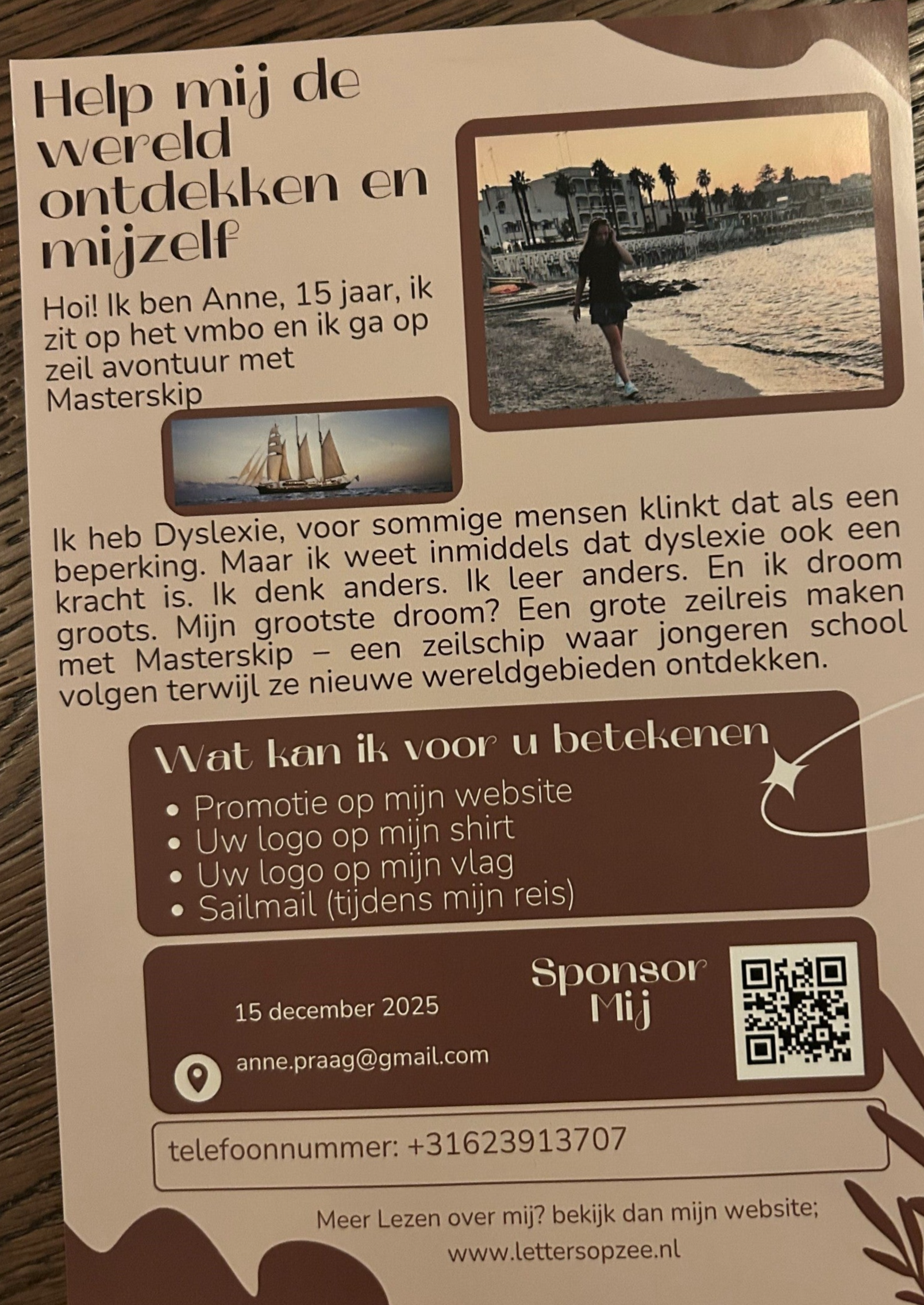 Na de zomervakantie ben ik echt actief gaan zoeken naar sponsoren. Ik heb een Sponsor flyer gemaakt met een QR code erop zodat mensen makkelijk kunnen doneren. Eerst geoefend bij vrienden en bekenden, wat is dat spannend zeg! Maar na de eerste paar gesprekjes en eerste donaties kreeg ik de smaak te pakken.